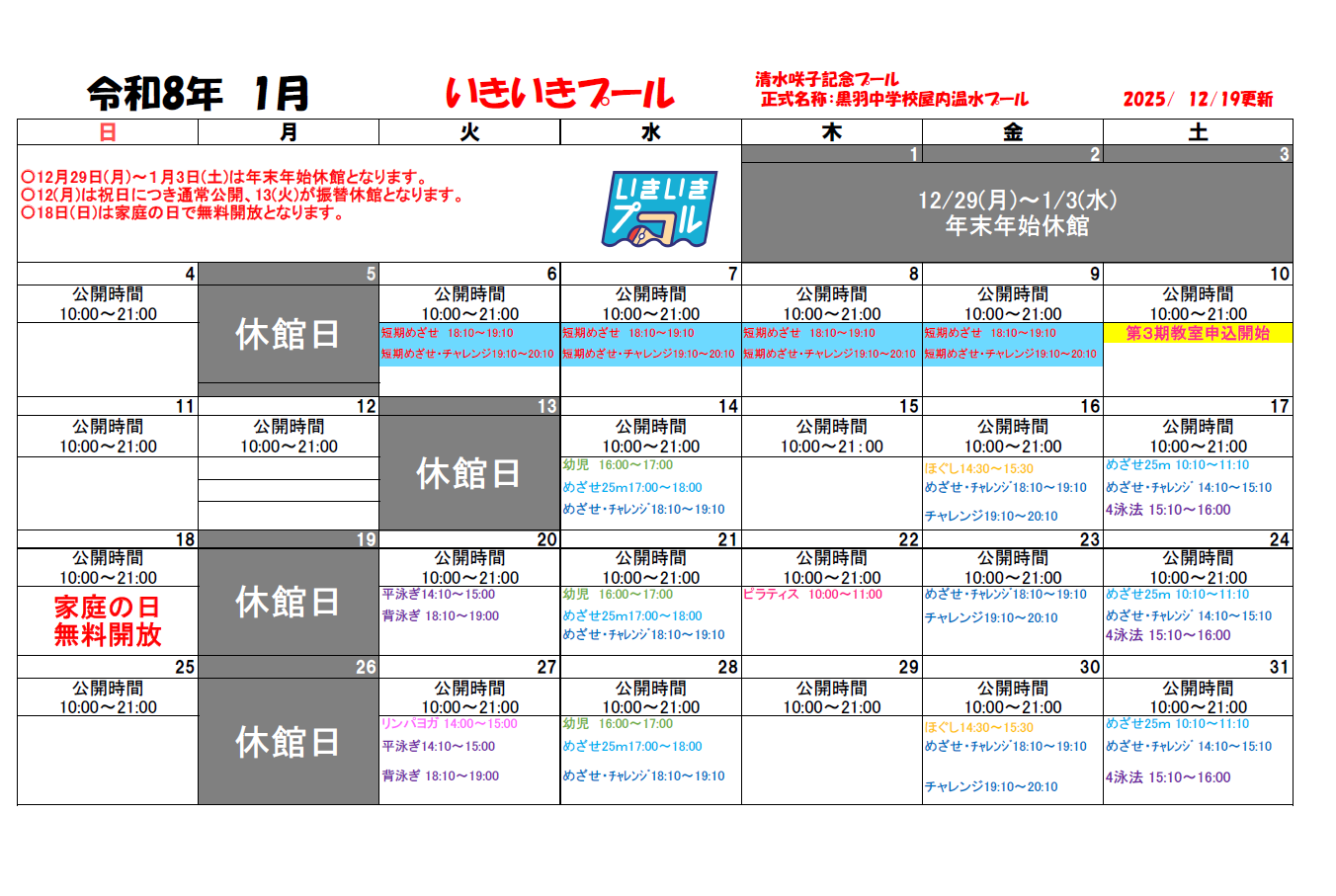 〇18日(日)は家庭の日で無料開放となります。