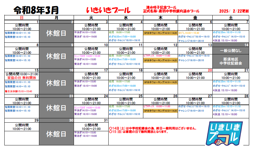 2026.02.23| いきいきプールお知らせ 令和8年3月予定表【黒羽】 3月のお知らせ 〇14日(土)は中学校記録会の為、終日一般利用はございません。 〇15(日)は家庭の日で無料開放となります。 PDFはコチラ→令和7年度3月予定表【黒羽】