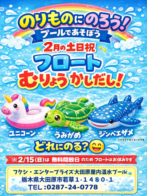 2026.01.28| FEP大田原温水プールイベント のりものに乗ろう! 2月の土日祝日はのりものを無料で貸し出します! ※2/15(日)の無料開放日は混雑防止のため実施いたしません。 ※幼児プールでのみ遊べます。 皆様のお越しをお待ちしております😊