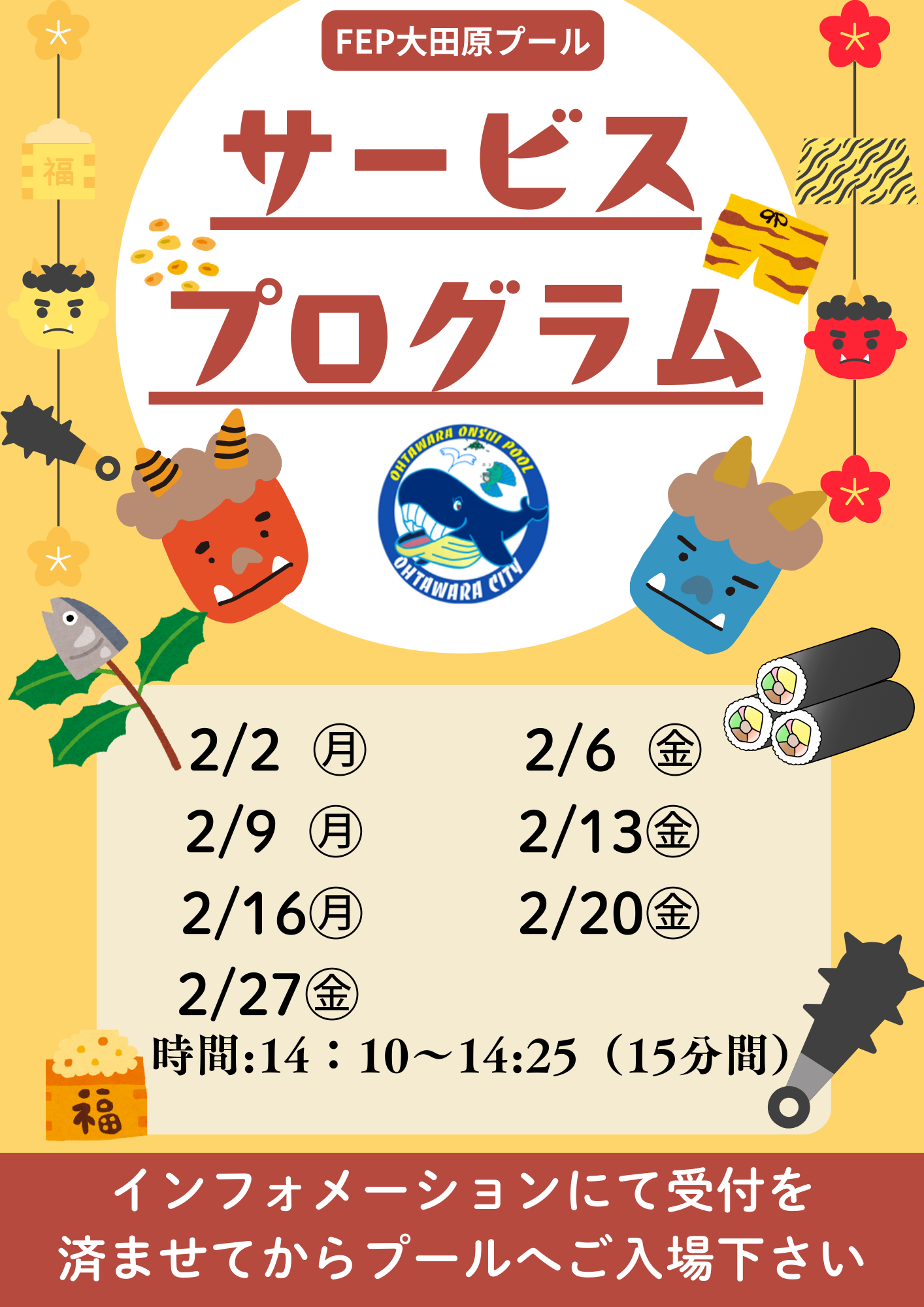 2026.01.18| FEP大田原温水プール教室 サービスプログラム【無料】2月 そろそろ2月になりますね👹 年度が替わるまで残すところあと1ヶ月となりました。 運動を始めてみませんか? 無料のサービスプログラムを実施します! 15分間の水中ウォーキング教室です! 皆さまのご参加をお待ちしております!